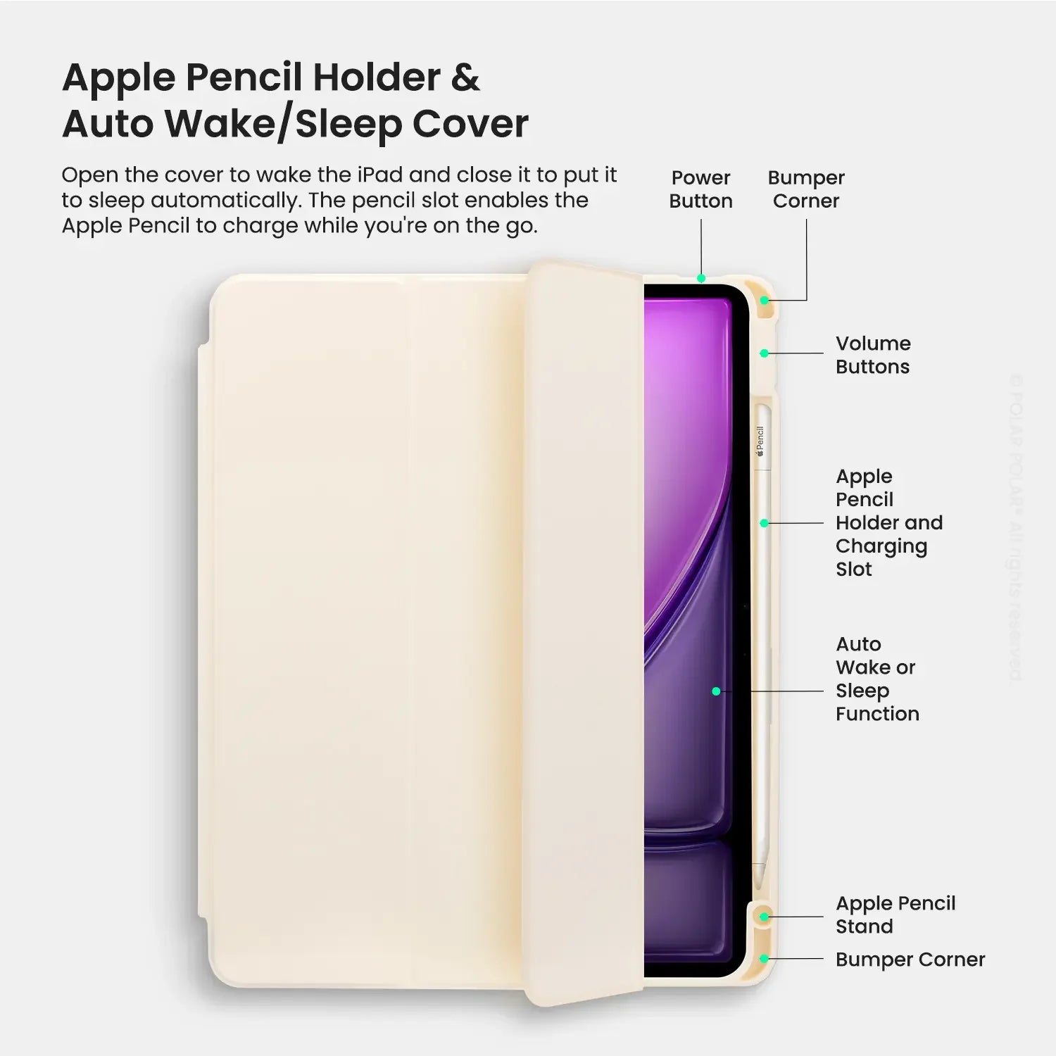 Open the cover to wake the iPad and close it to put it to sleep automatically. The pencil slot enables the Apple Pencil to charge while you're on the go.