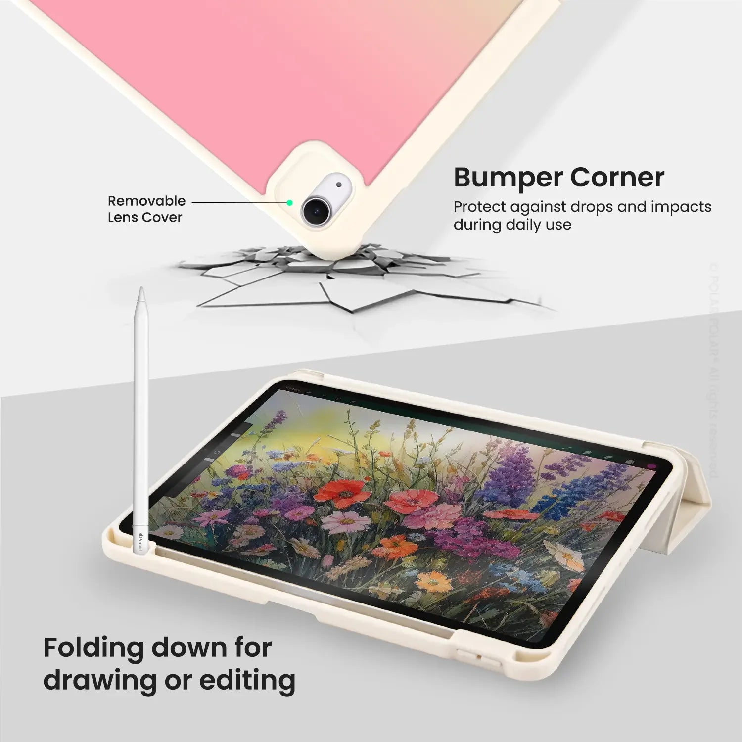Open the cover to wake the iPad and close it to put it to sleep automatically. The pencil slot enables the Apple Pencil to charge while you're on the go.